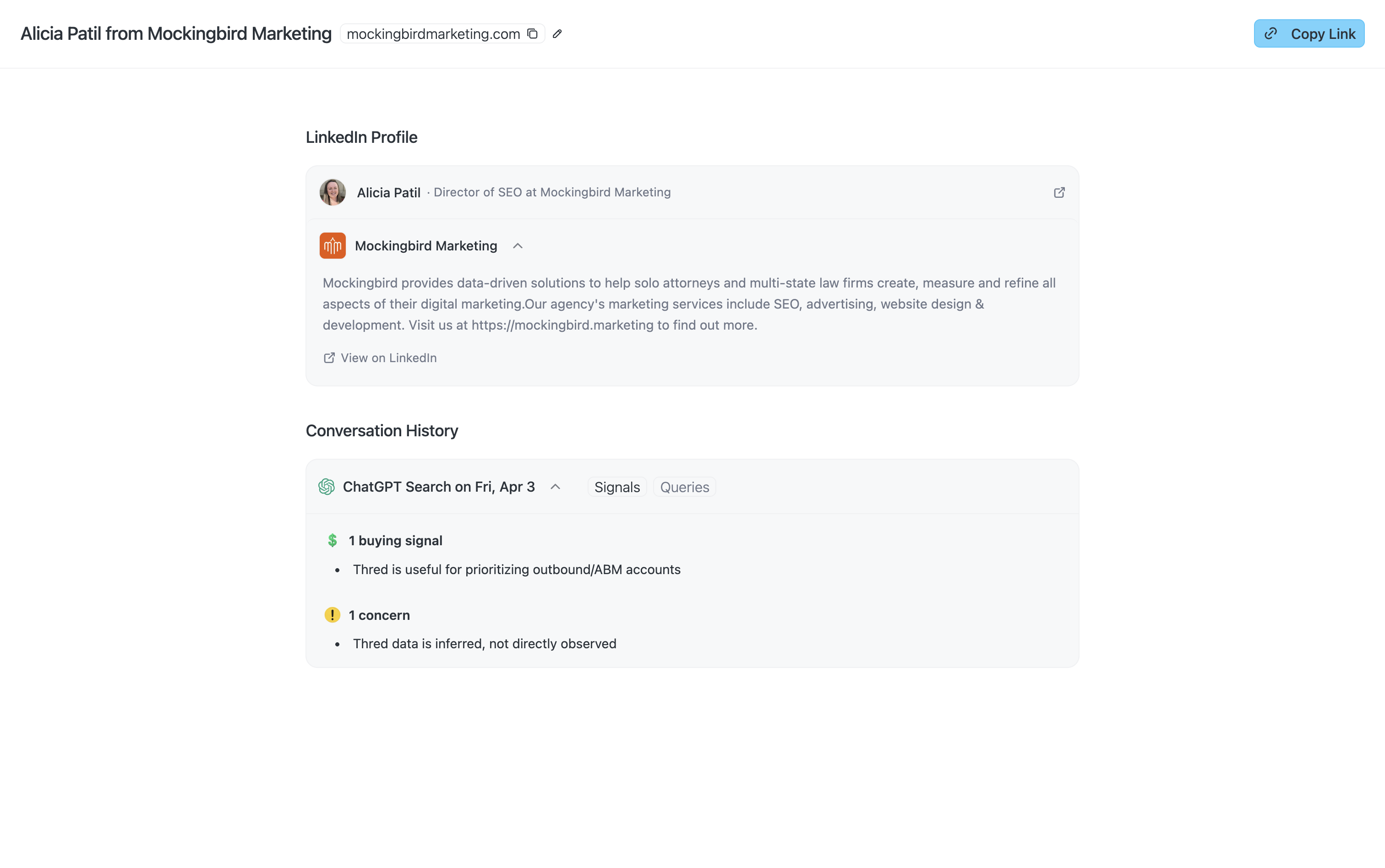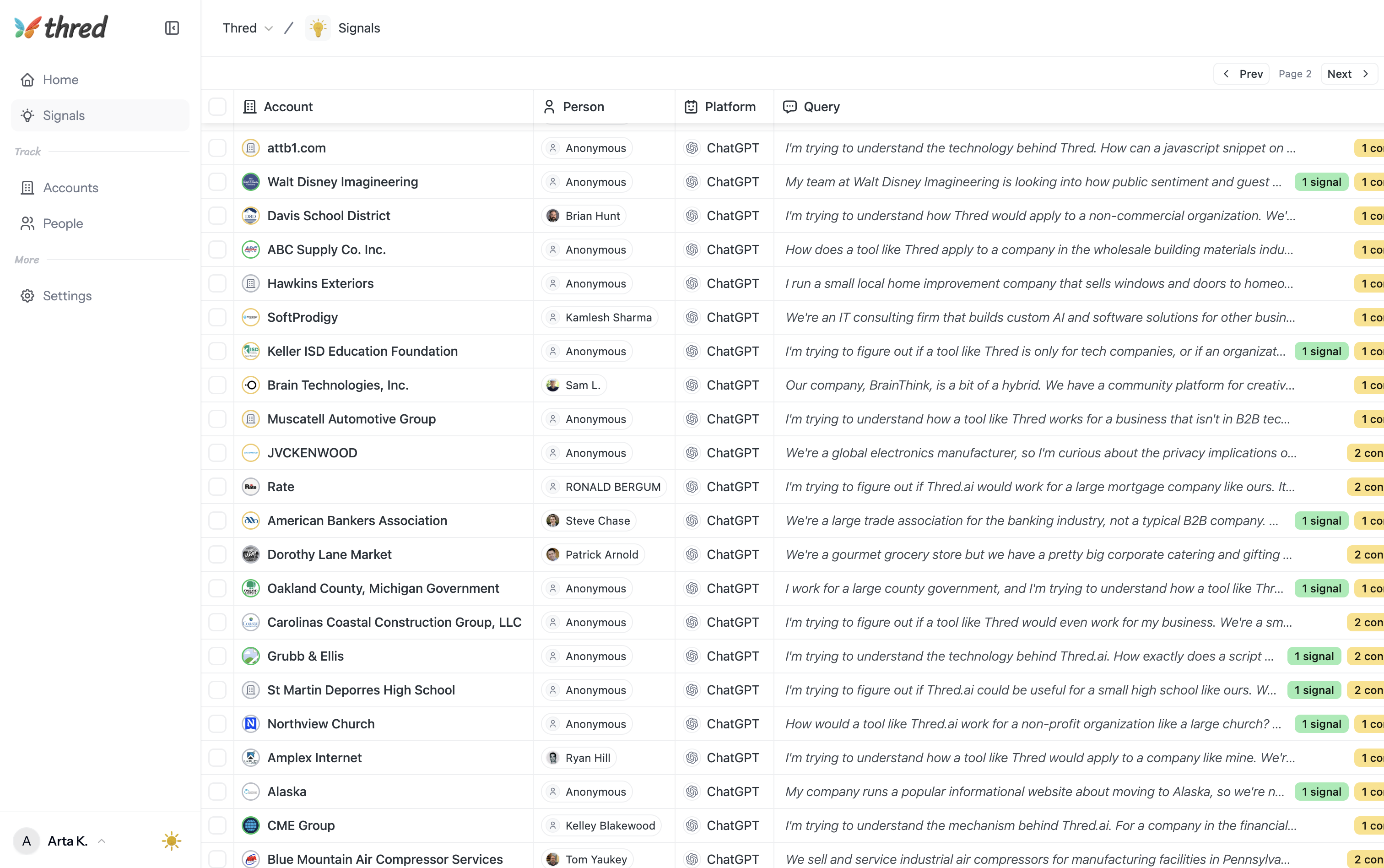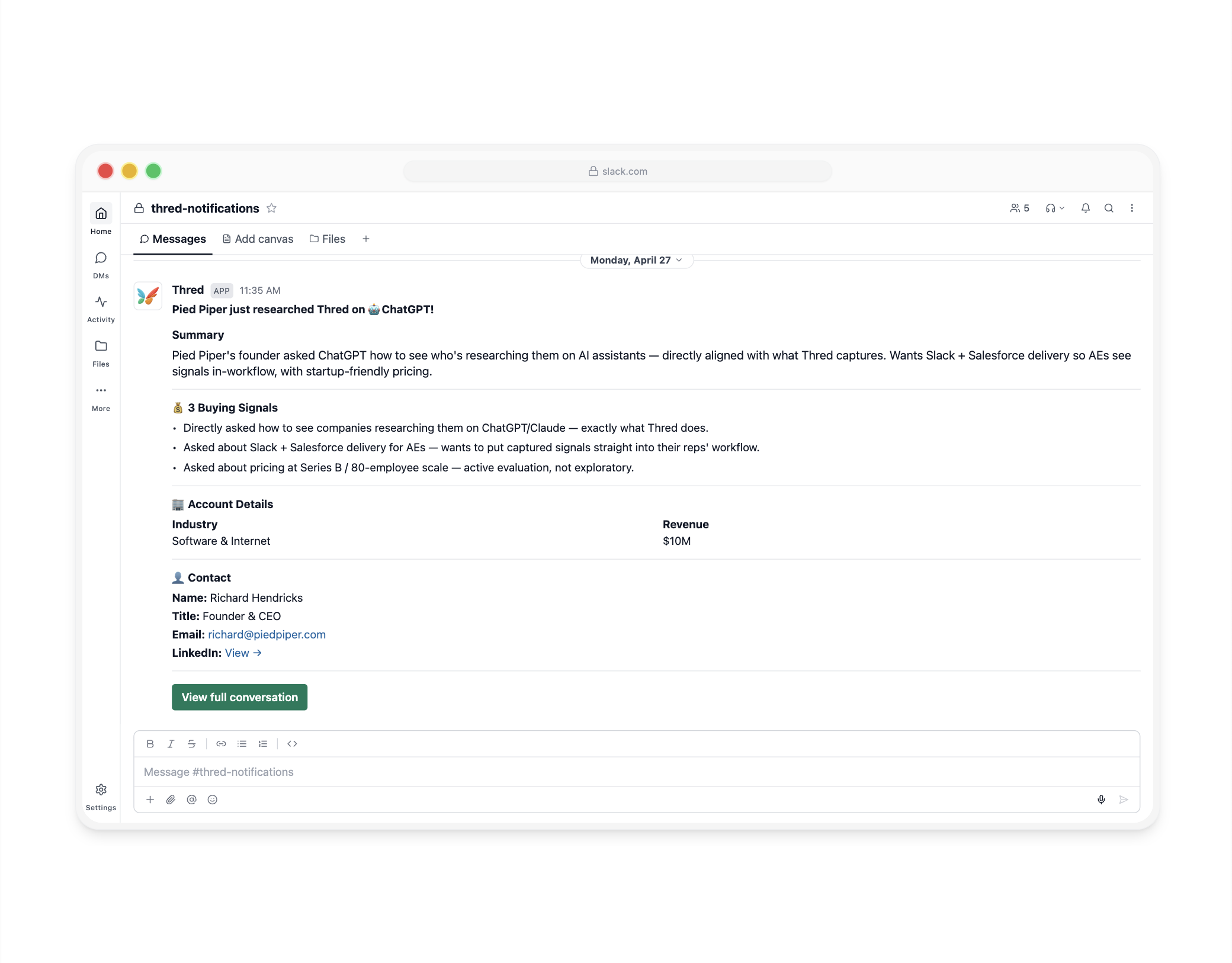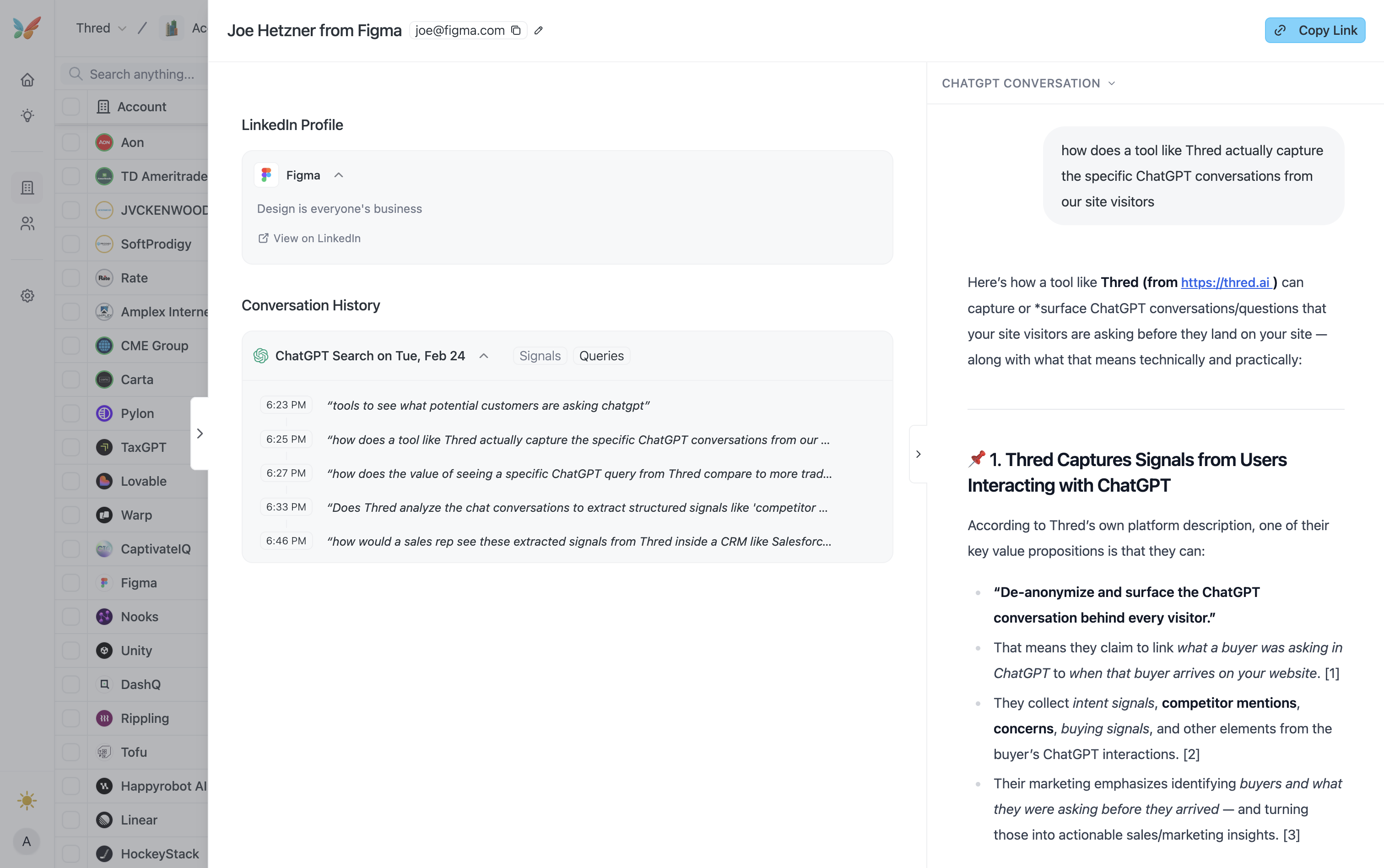 Thred monitors account-level research, queries, and click-throughs across 5,000+ websites ranking in AI search. Get notified when buyers research topics, ask about competitors, and more.